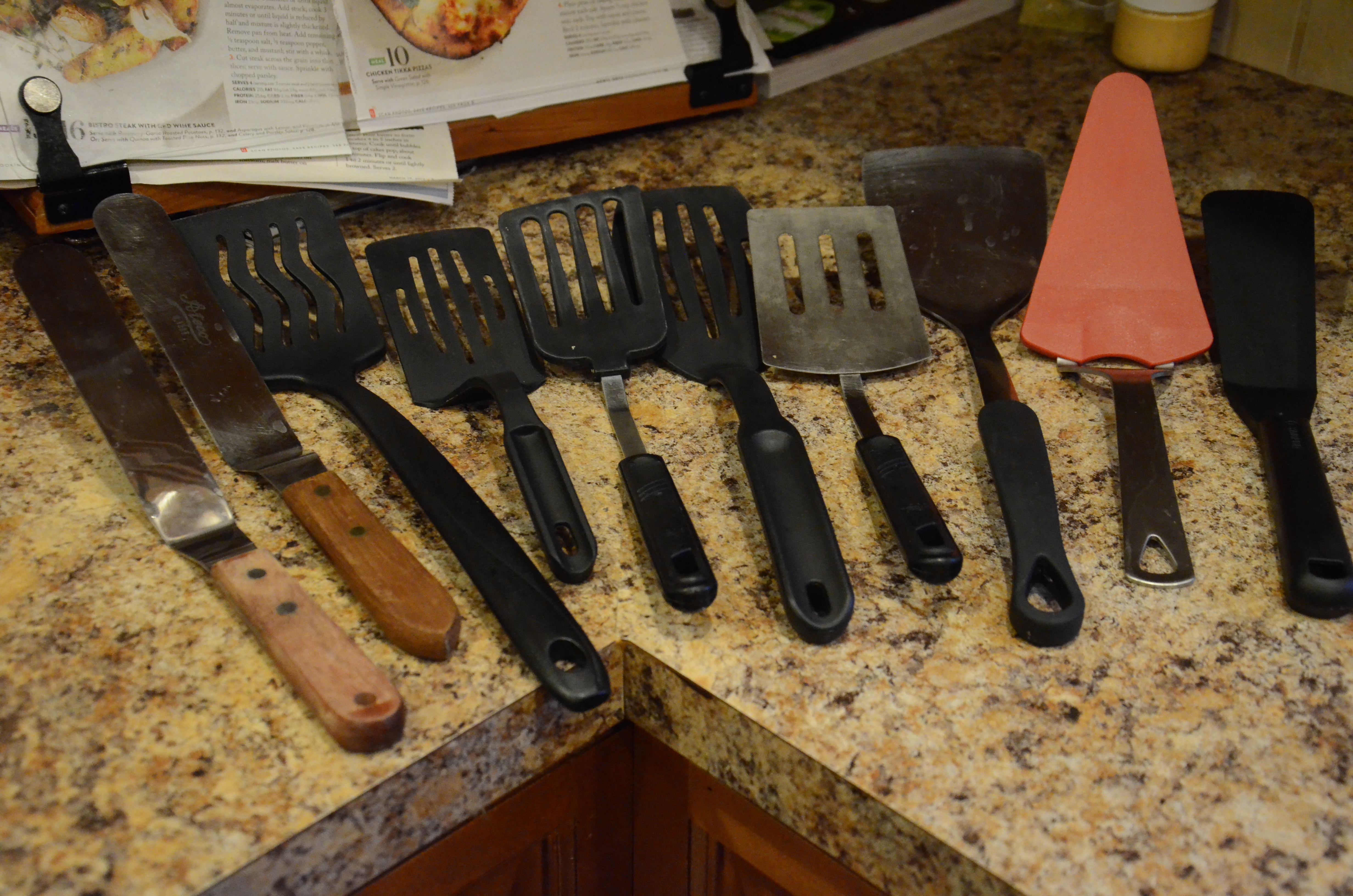 This is what gave me the idea to assess the kitchen utensils we own in a similar way. Take a look at the number of spatulas we have.