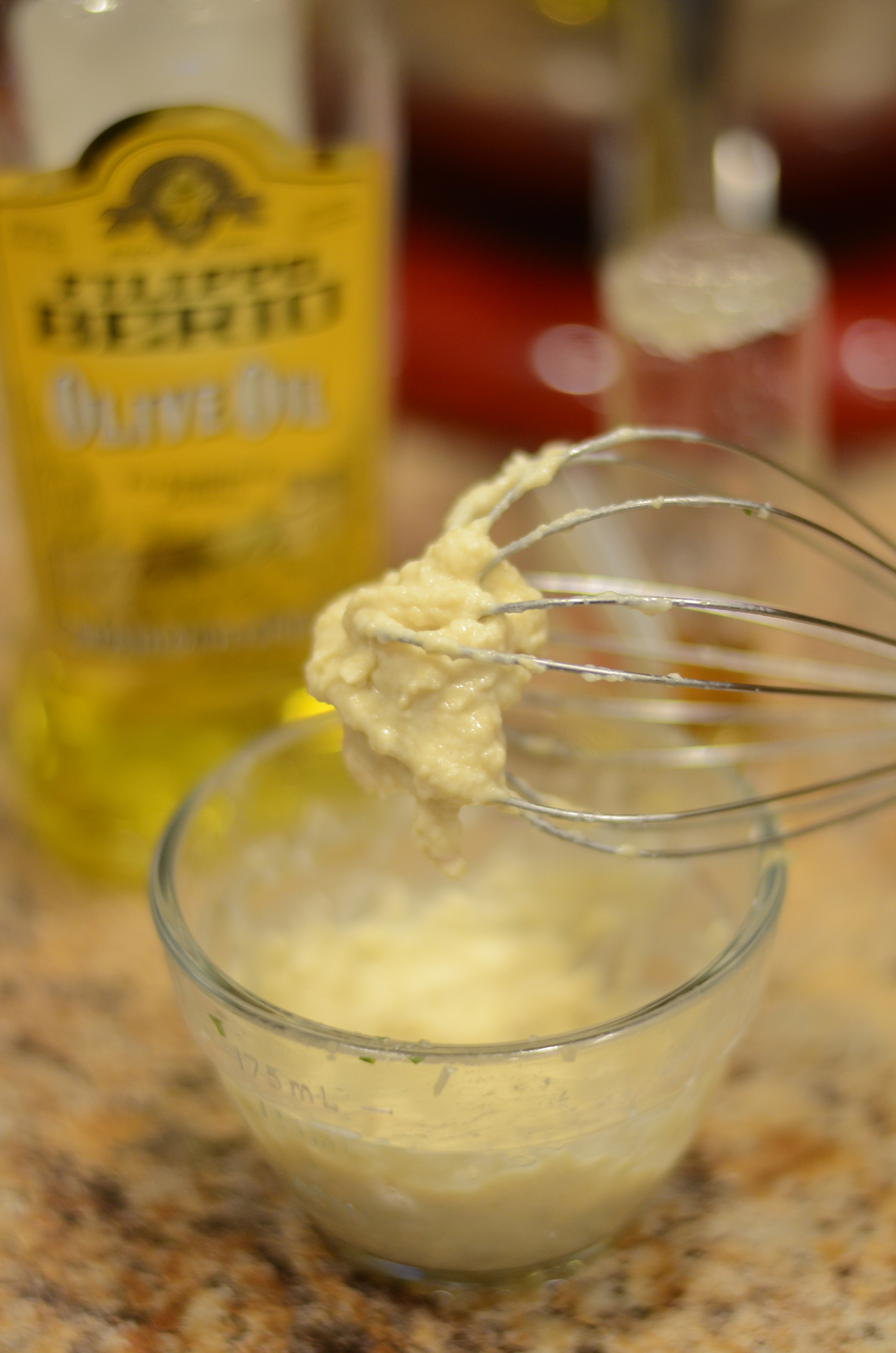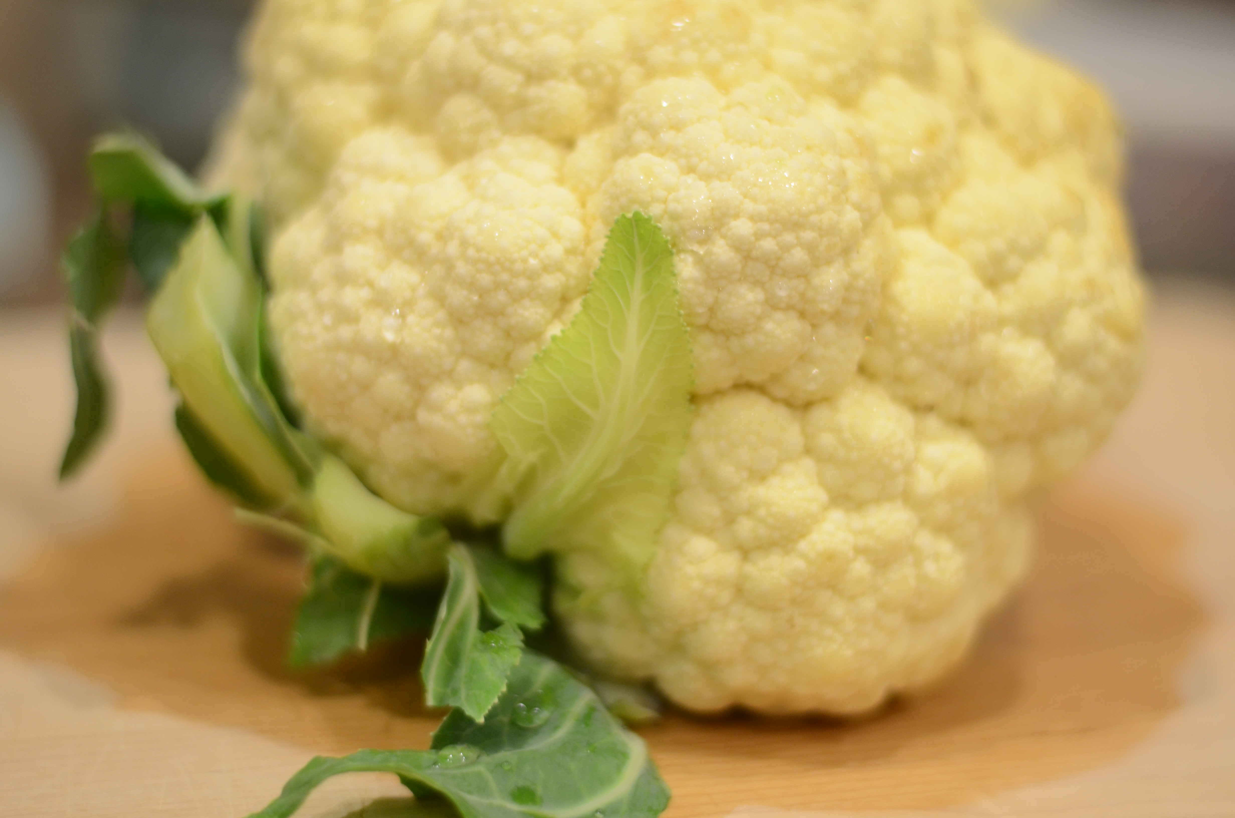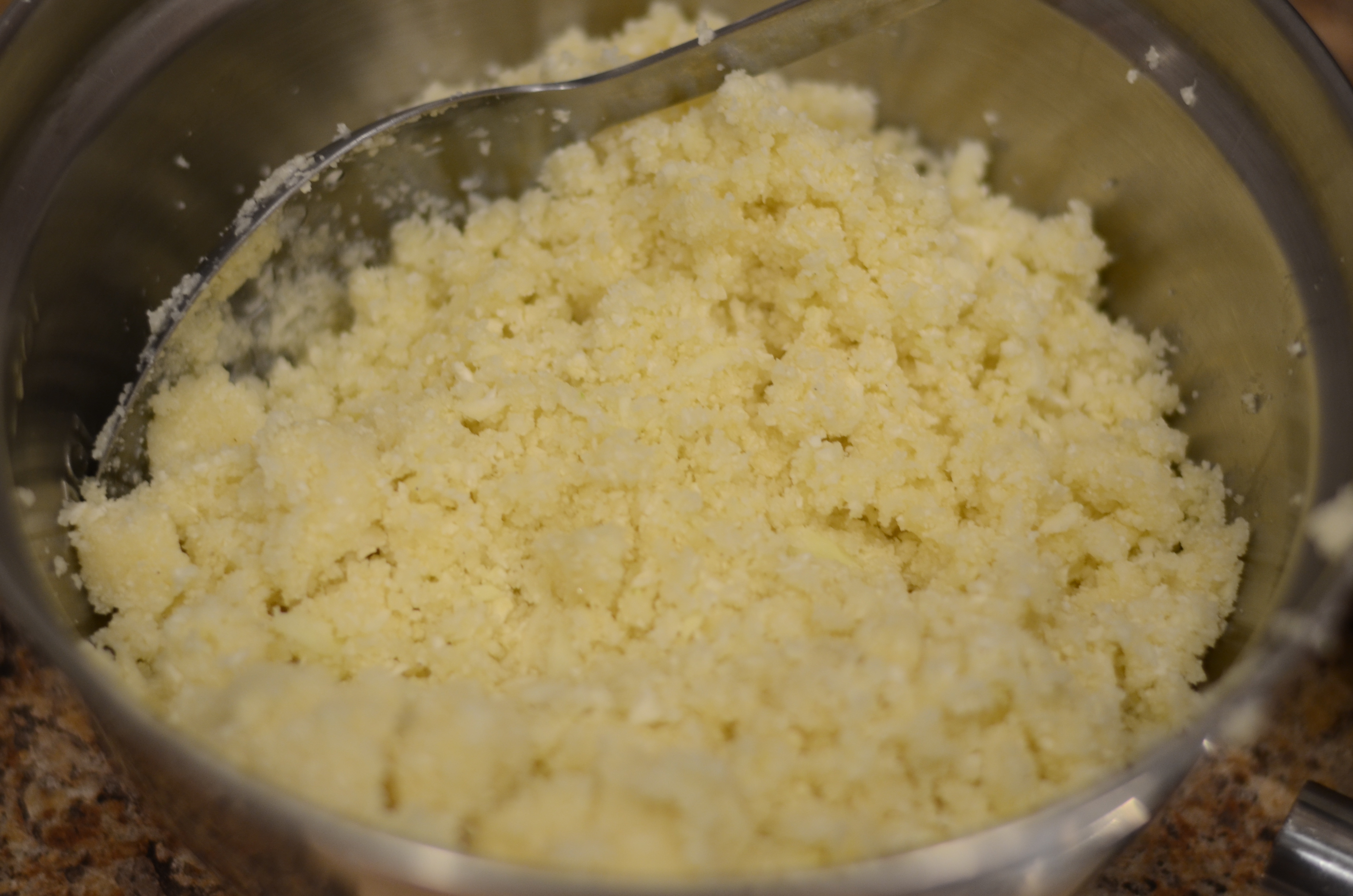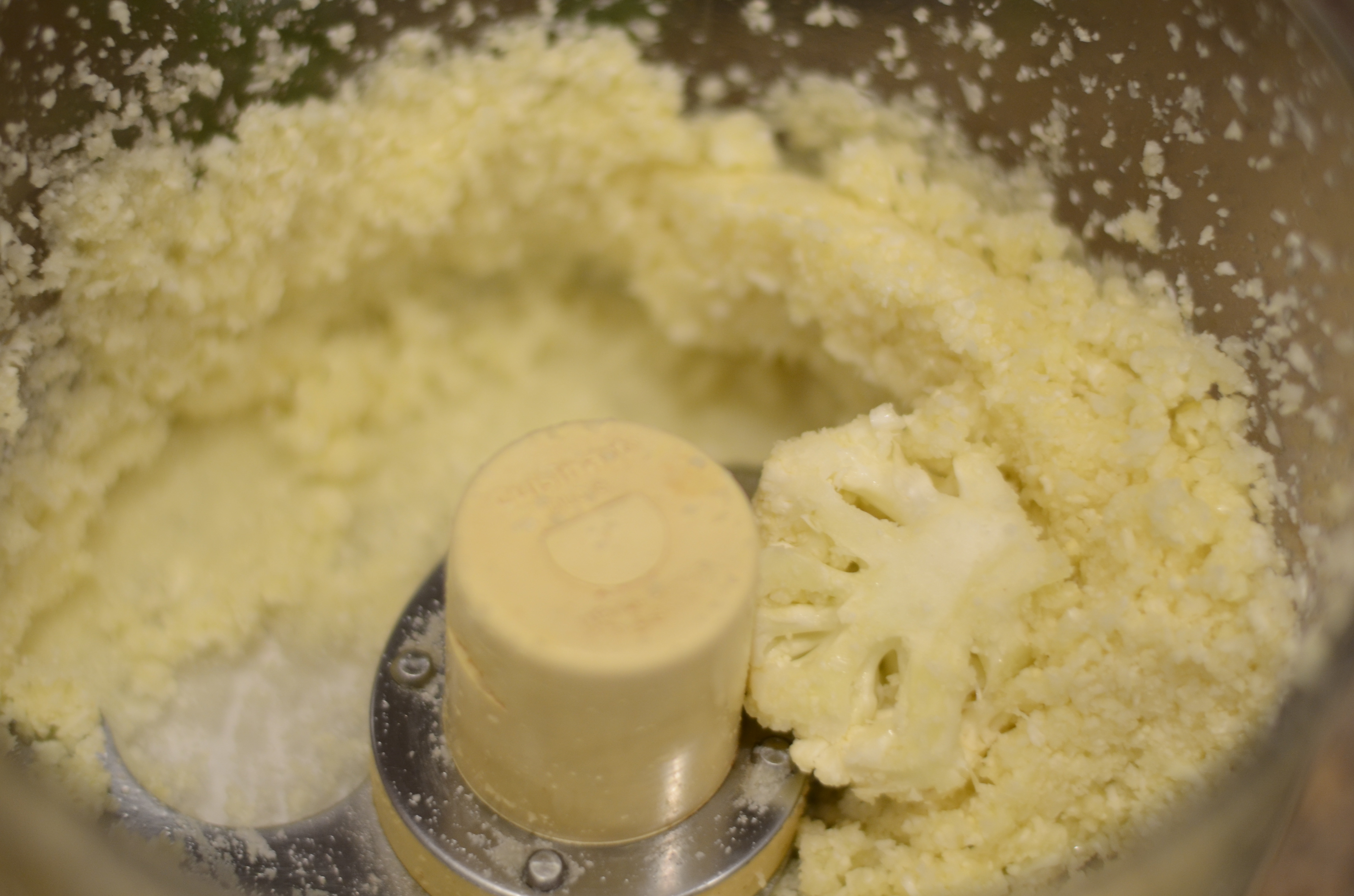 Stop when the bowl is about halfway full to allow space for processing (it is much easier to do this in two batches rather than forcing all the cauliflower in and having to pulse and stir repeatedly-trust me).