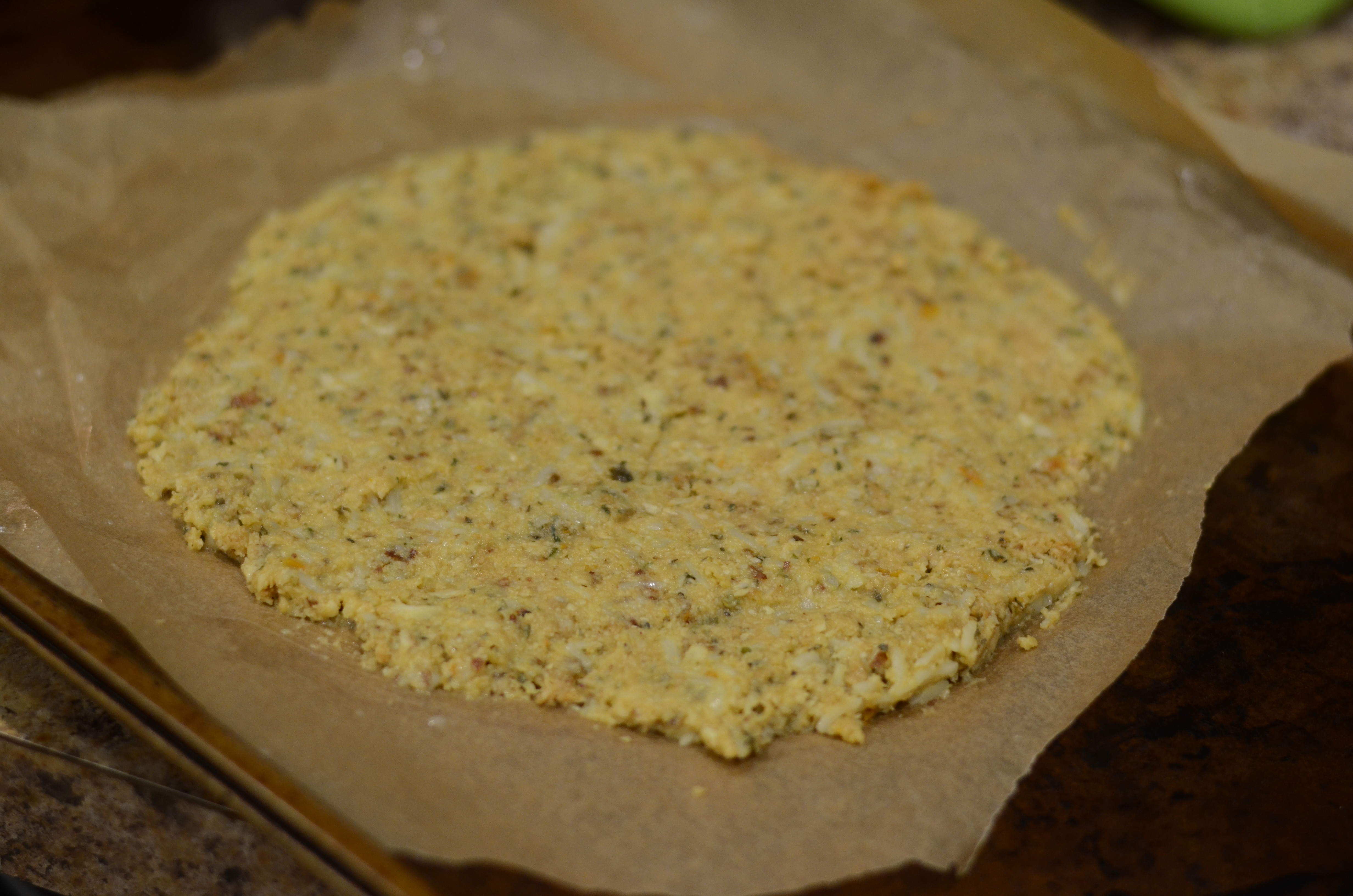 I had all this leftover cauliflower pesto, and I didn’t want to keep eating it with pasta. Fortunately, I remembered hearing that you can use a cauliflower mixture as a pizza crust.