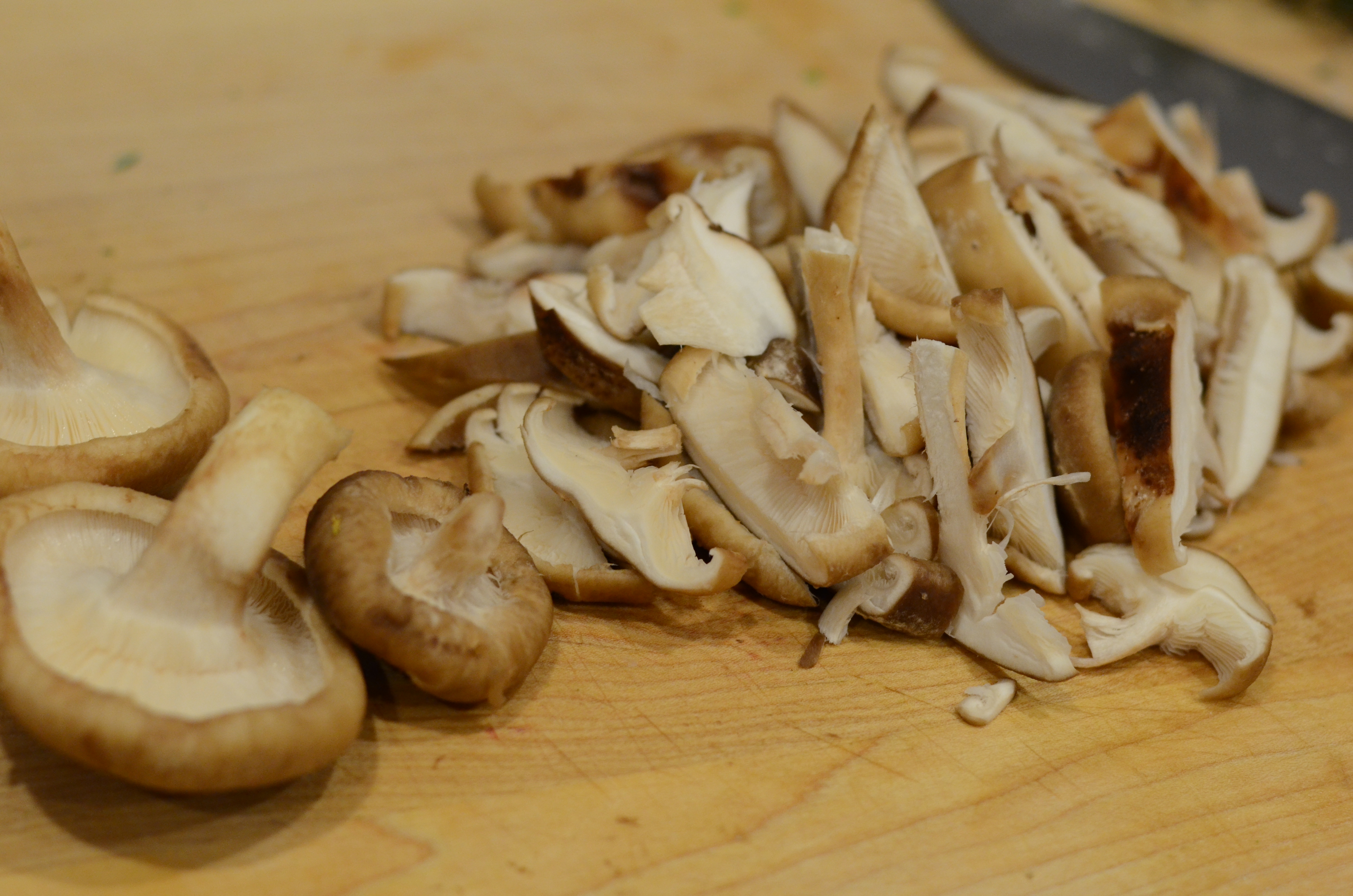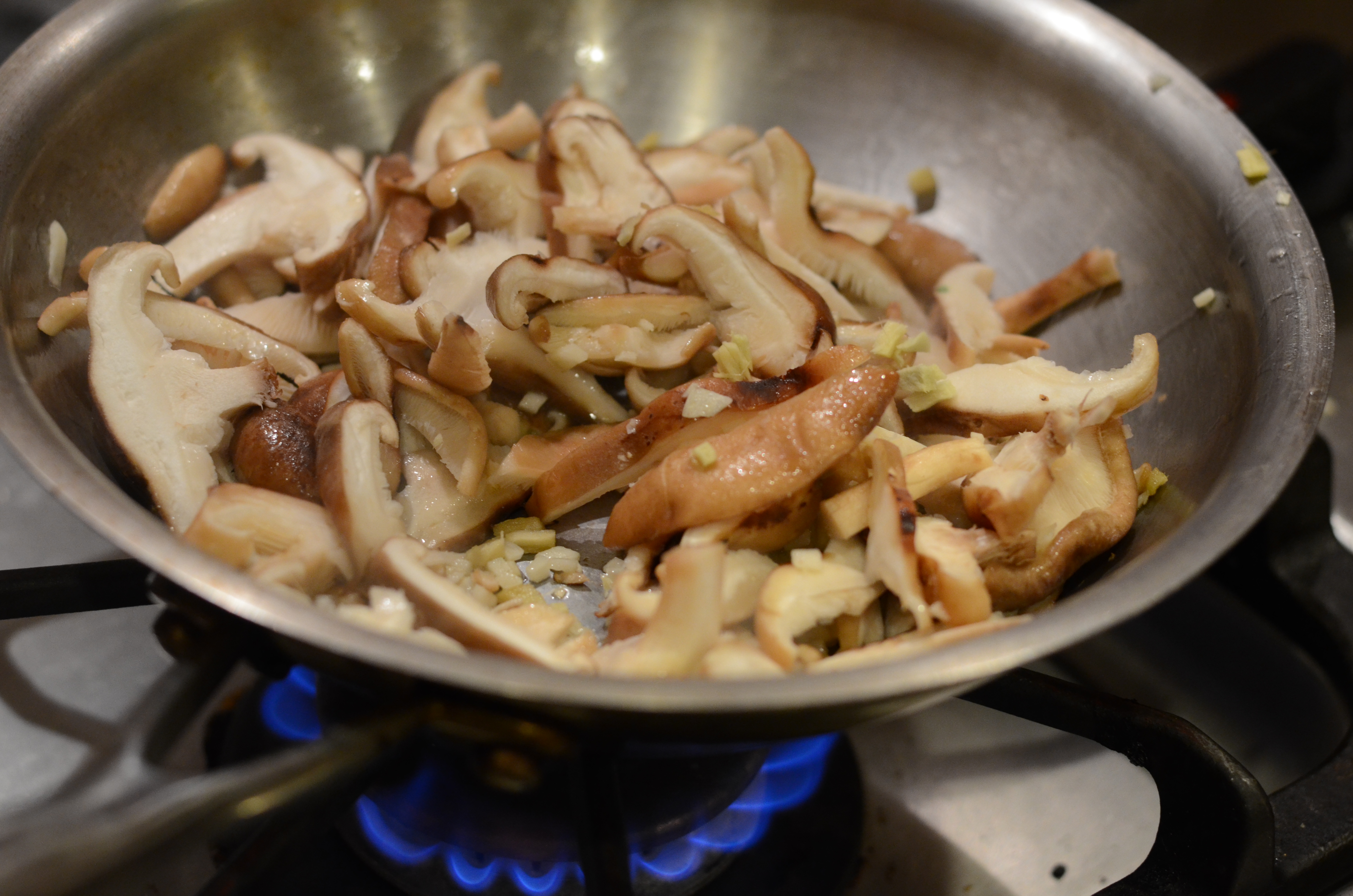 Add mushrooms, 1.5 teaspoons minced ginger, and 1.5 teaspoons garlic; cook 2 minutes. Add sherry and cook until liquid evaporates and mushrooms are tender, about 3 minutes.