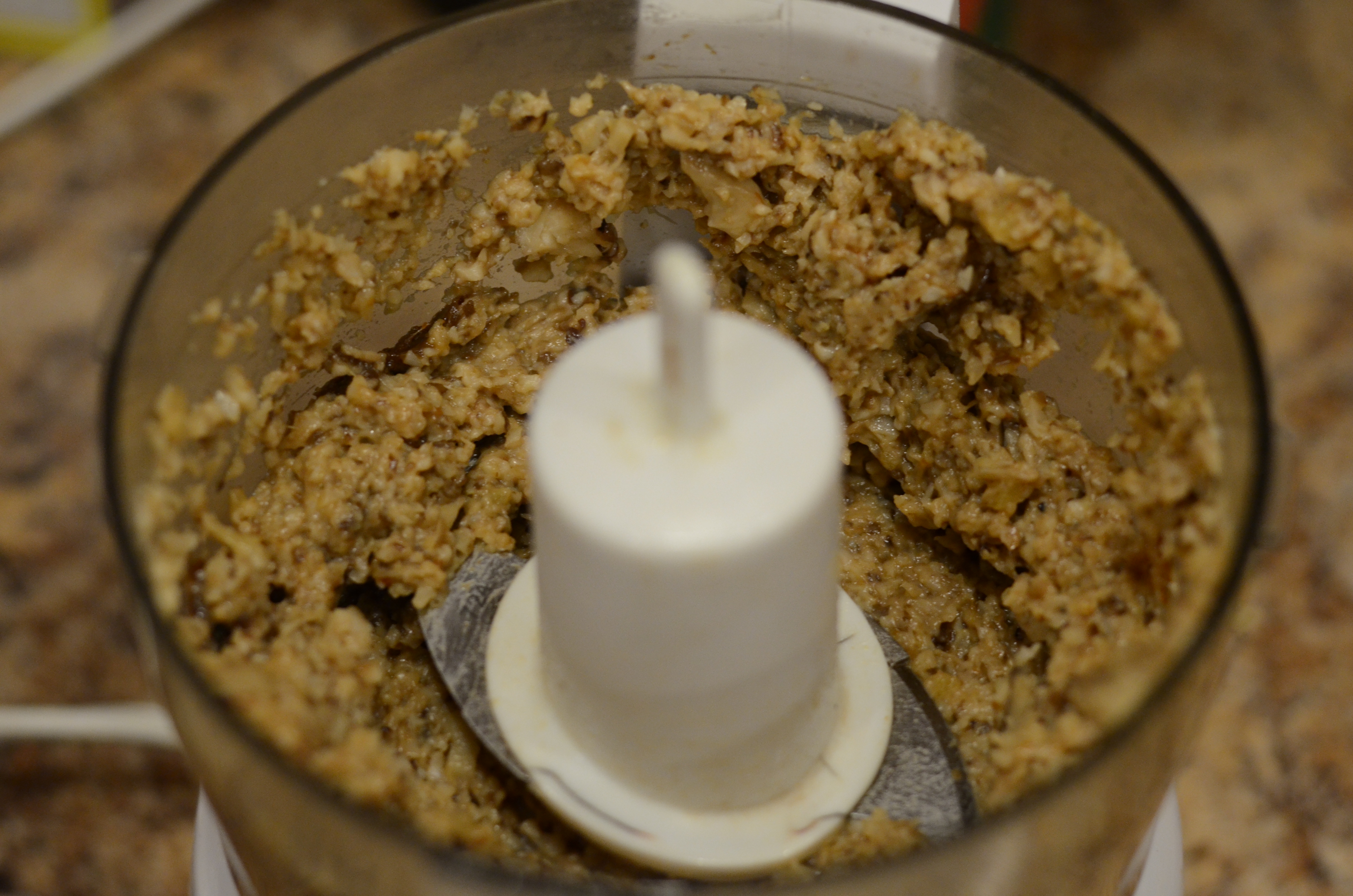 Remove from heat and allow to cool while you chop and measure the remaining meatball ingredients. In a mini food processor, place mushroom mixture along with the red miso. Pulse until very finely chopped, scraping down as needed.