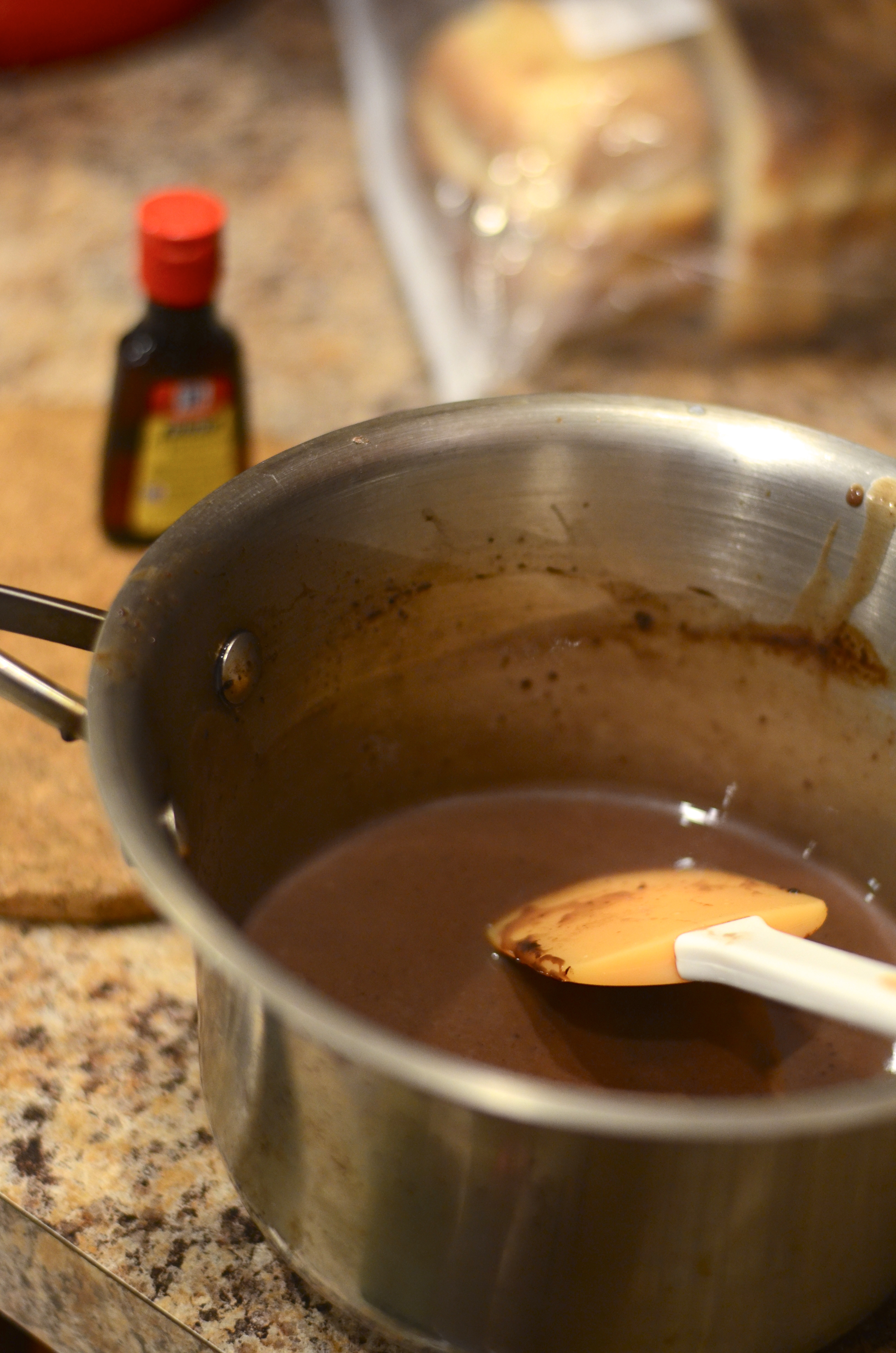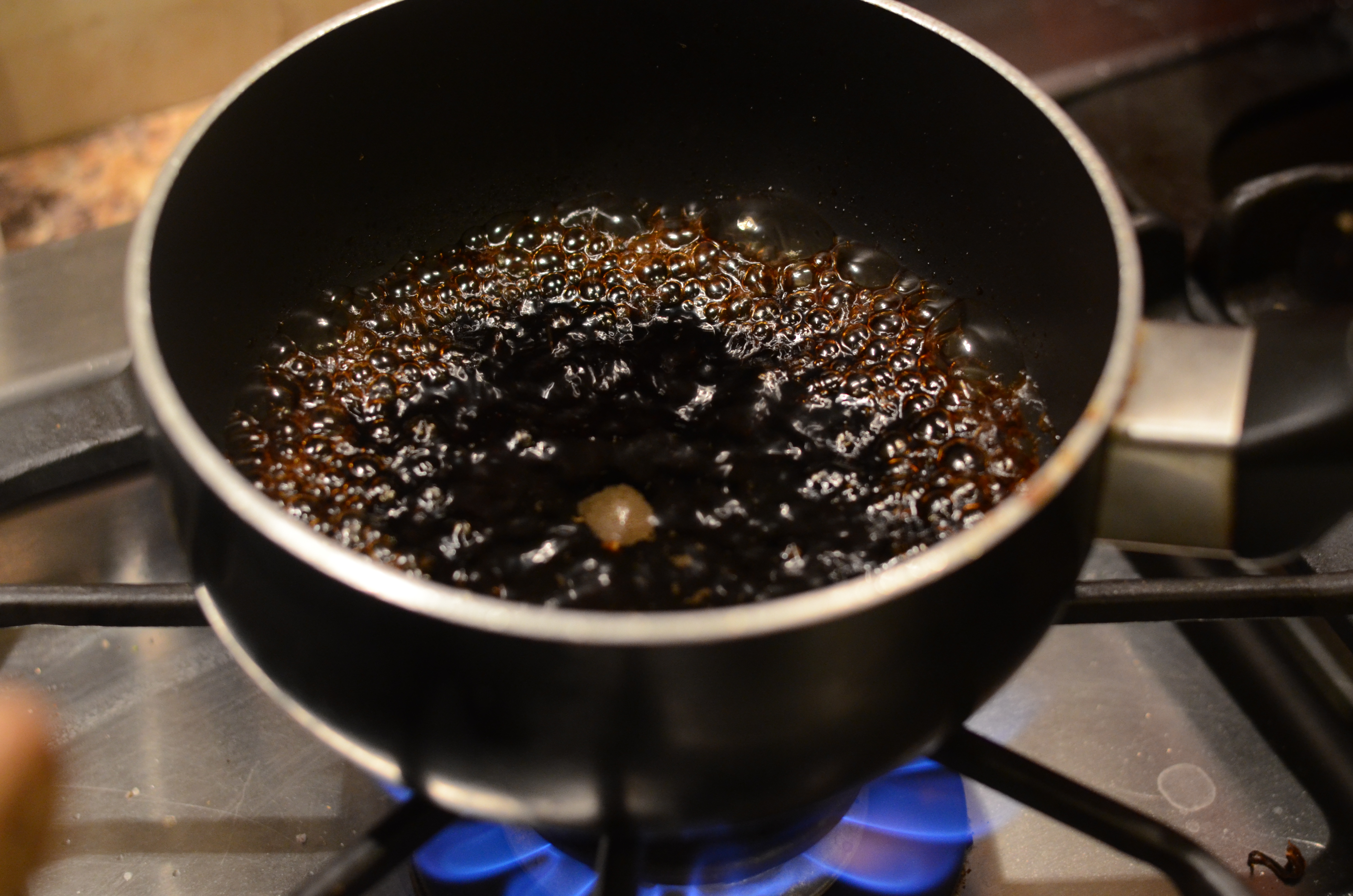 To prepare sauce, add mirin, soy sauce, sugar, and vinegar to a small saucepan. Bring to a boil and cook until slightly thickened (this took at least 5 minutes for me).
