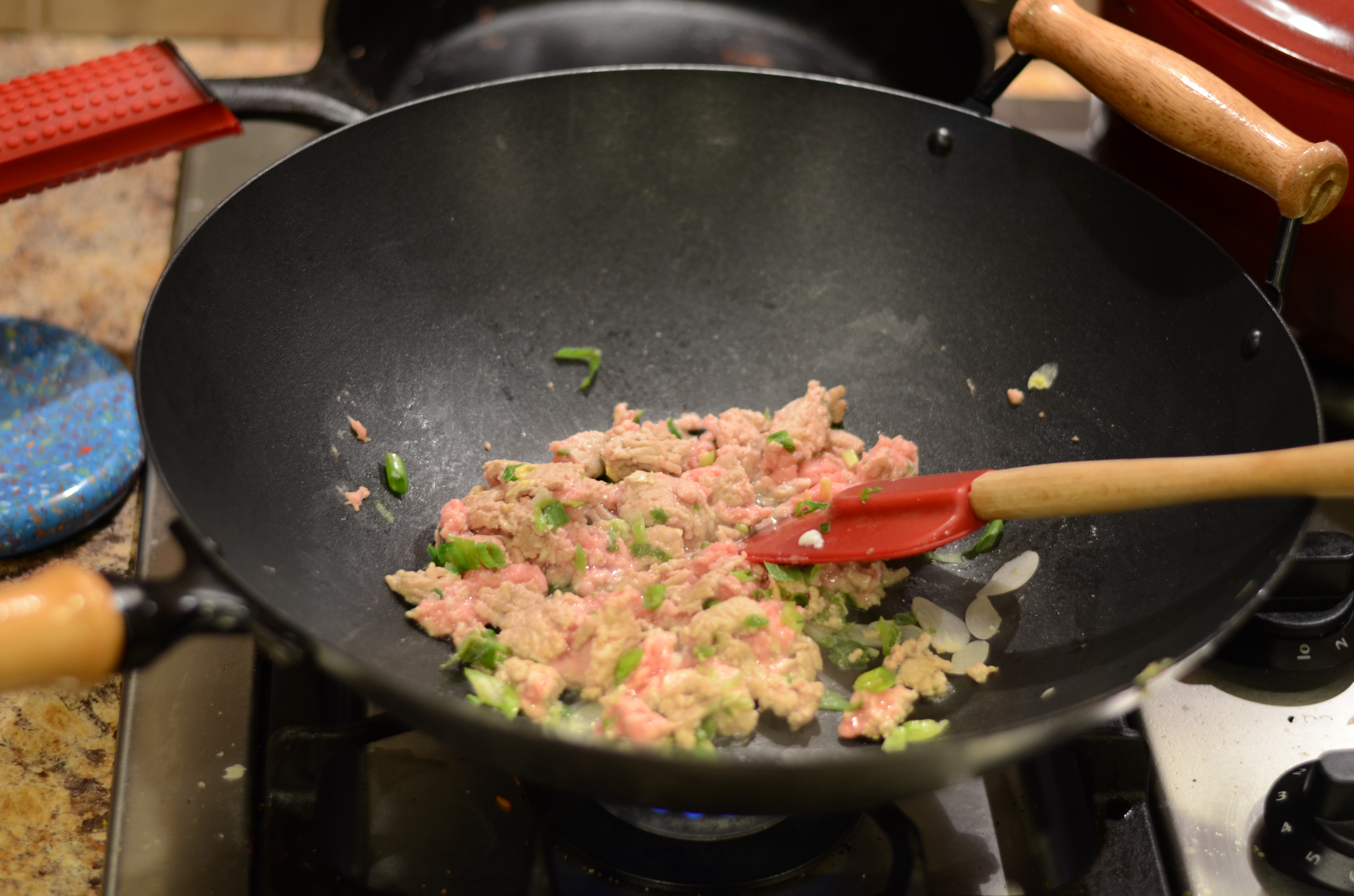 Combine mushroom mixture, remaining 1.5 teaspoons minced ginger, remaining 1.5 teaspoons garlic, meat, and remaining meatball ingredients (through egg white) in a bowl. Shape mixture into 1 inch meatballs–approximately 24. At this point, if your meatballs are staying together well, you could skewer them onto 6 inch bamboo skewers so that they could be grilled on the stick. I did not do any threading (nor did other reviewers) and I don’t think it’s necessary.