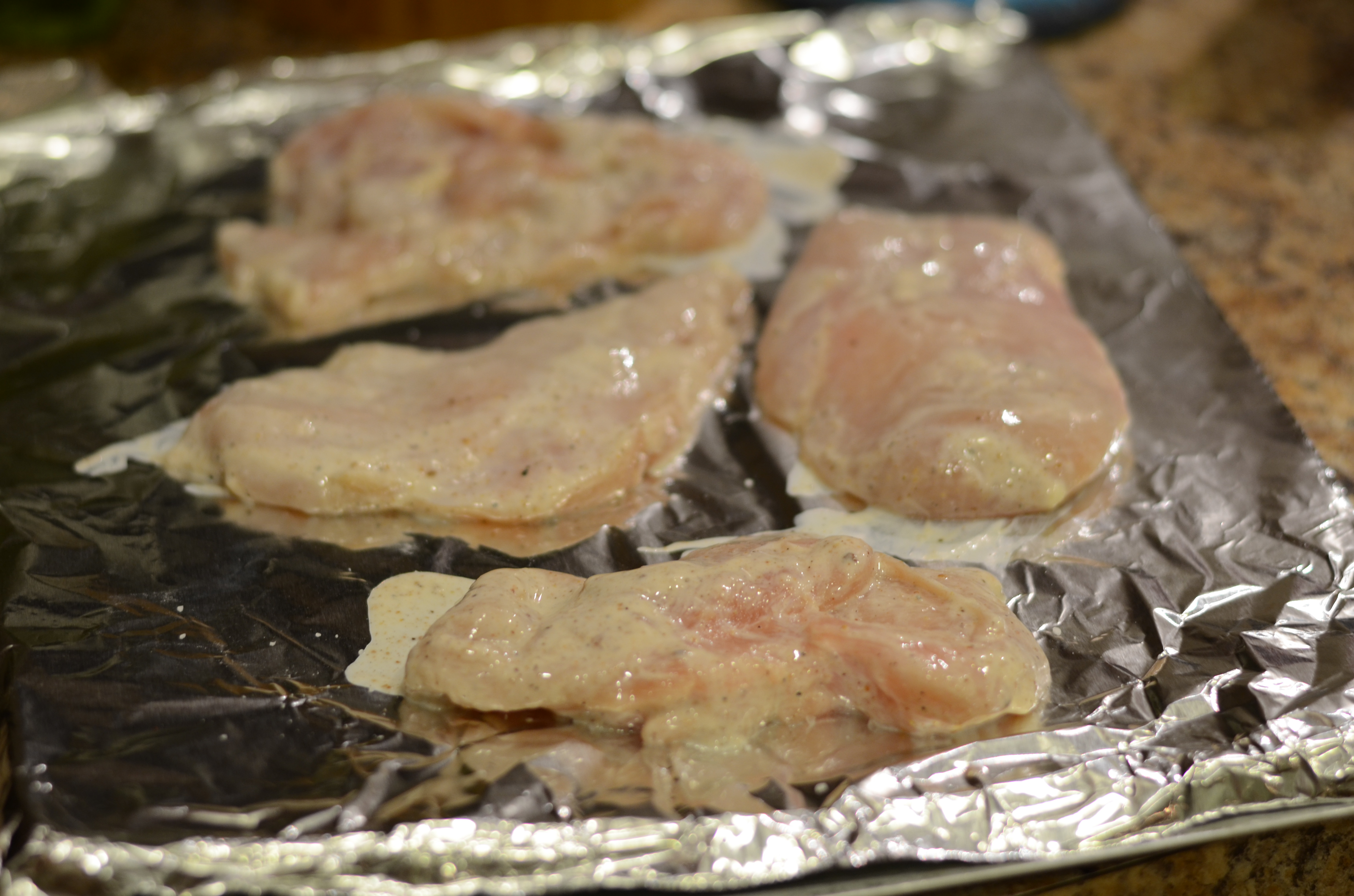 Preheat broiler to high. Cut chicken in half horizontally. Combine chicken, yogurt, and 1/2 teaspoon garam masala. I let mine sit in the mixture for about 15 minutes while I prepared some of the other ingredients, and raita, so it would marinate a little bit.