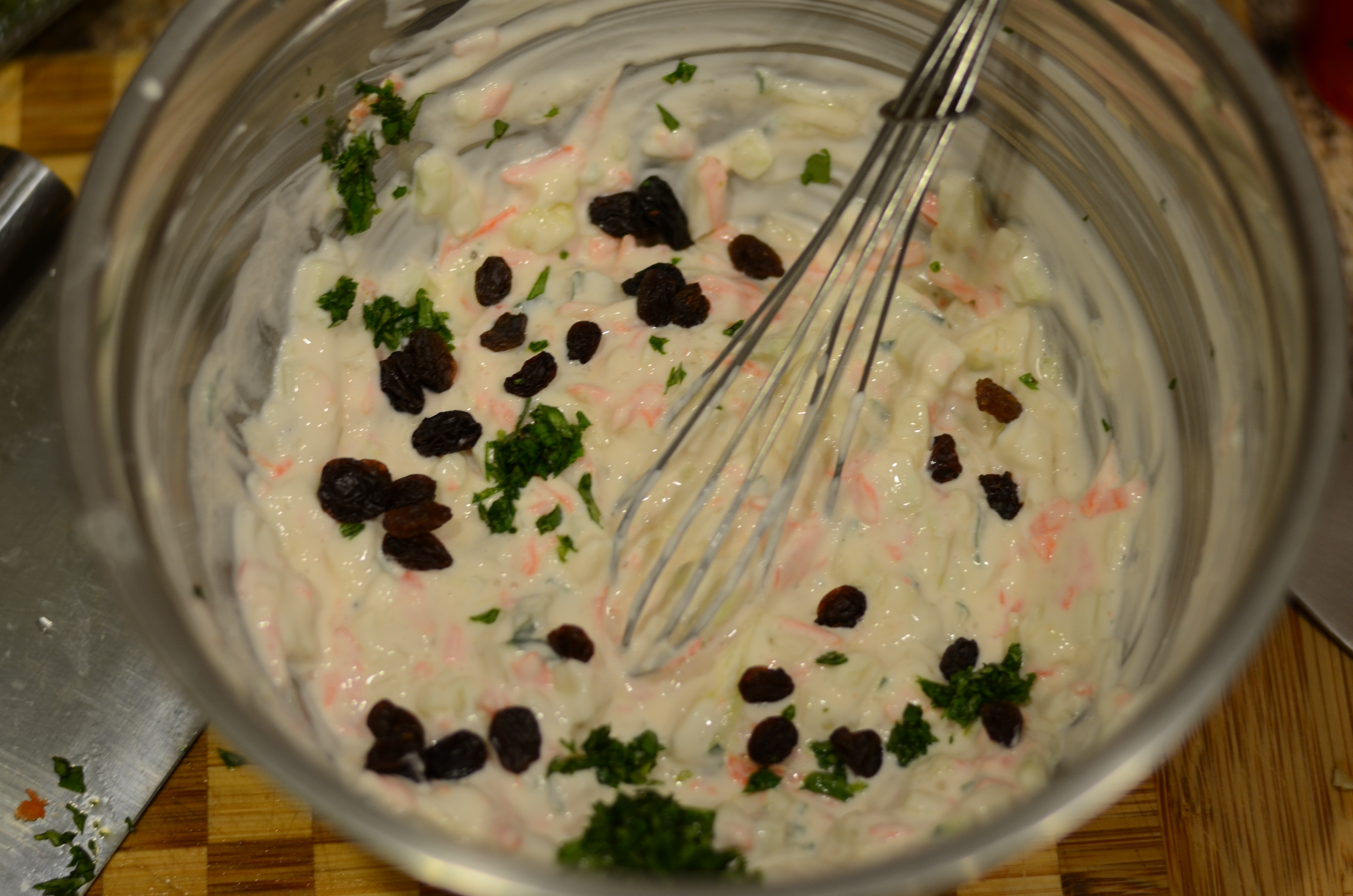 I followed the original recipe for this recipe pretty much exactly one time before, and it was a hit. This time I modified it a bit because I had some carrots that were starting to languish, and some reviewers said that you can use any vegetables. Also, cilantro and mint are apparently interchangeable for this. Lastly, I ran out of golden raisins, but I remember that the burst of sweetness they provided was especially tasty, so I had to try it with regular raisins.