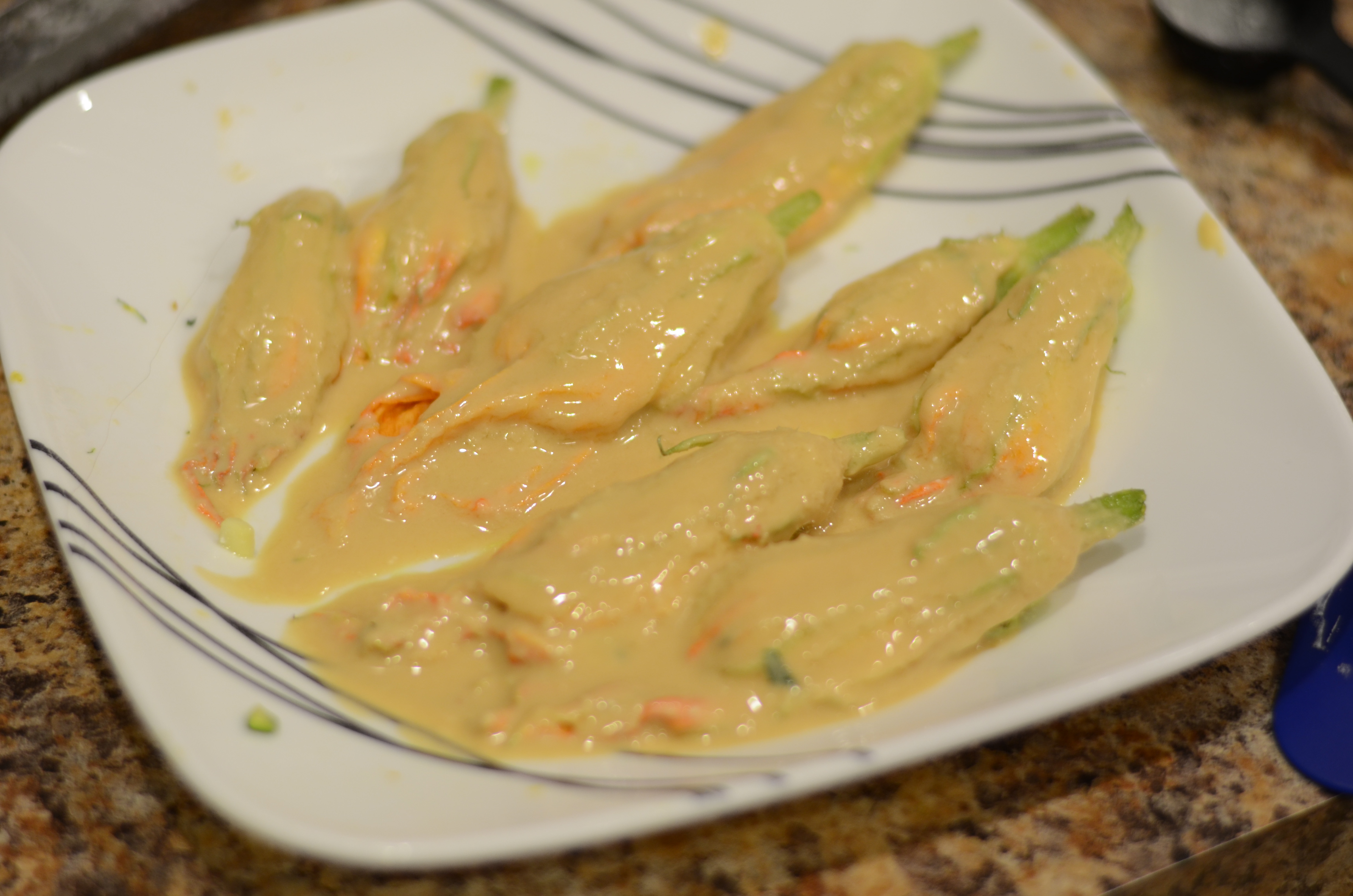 Pour in the olive oil slowly. The smooth mixture will become an orange-pink color and look like a salad dressing.